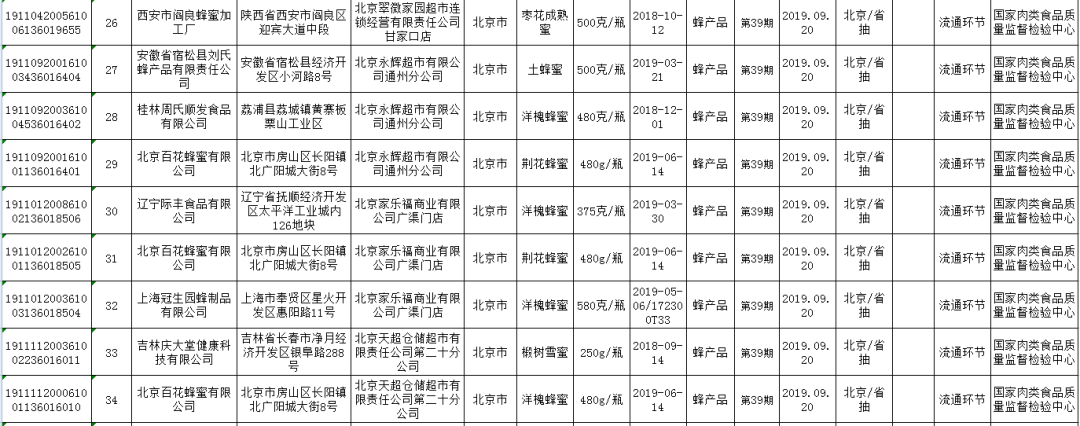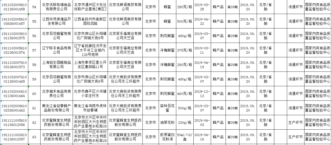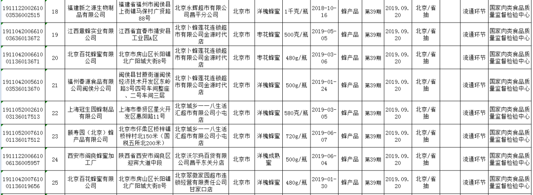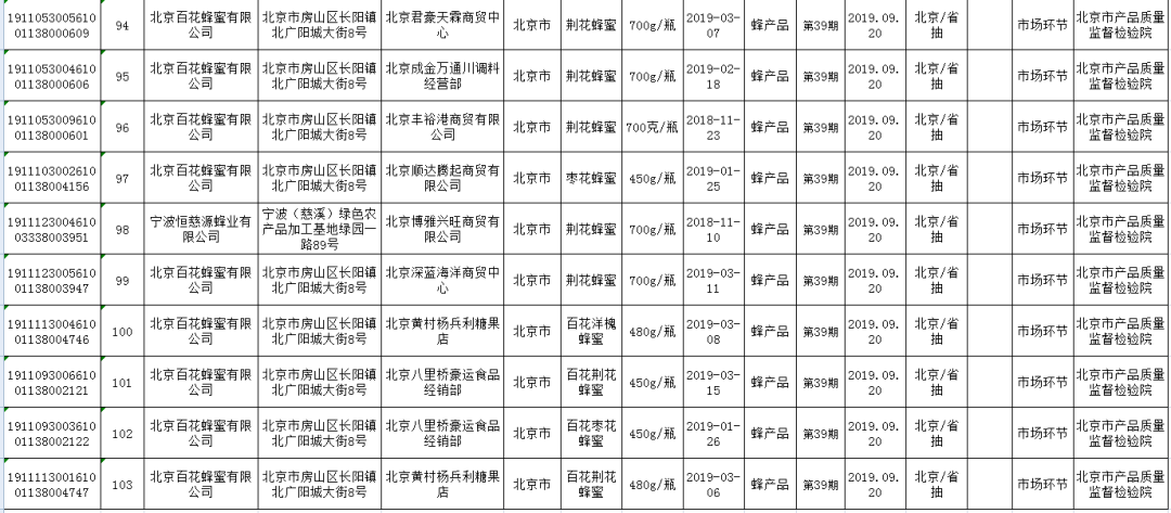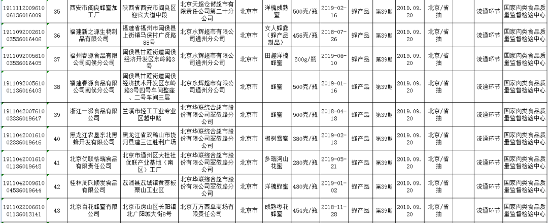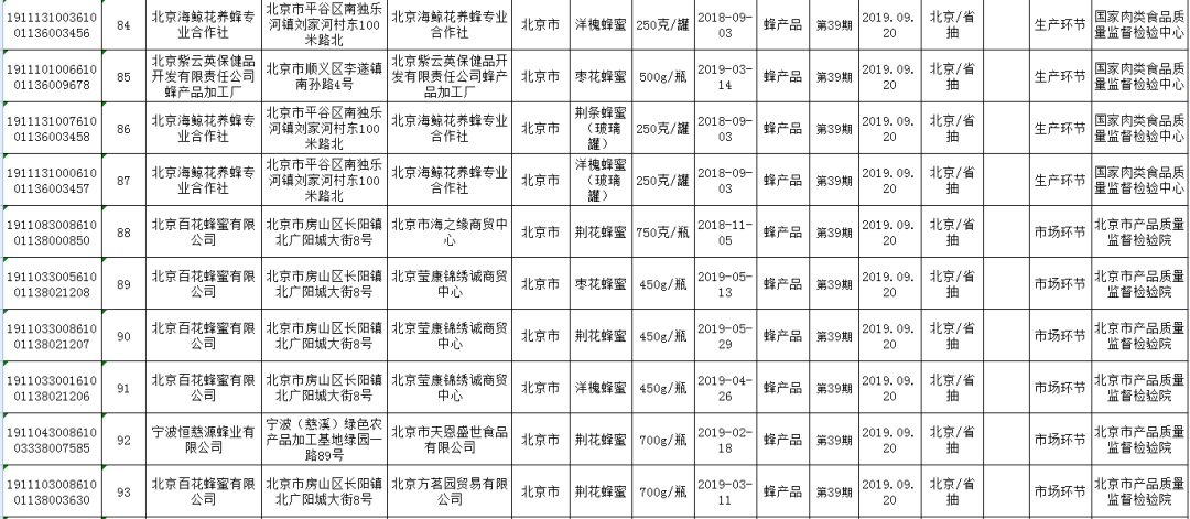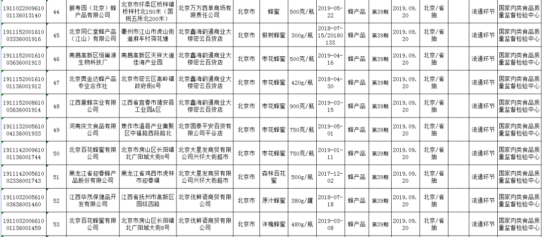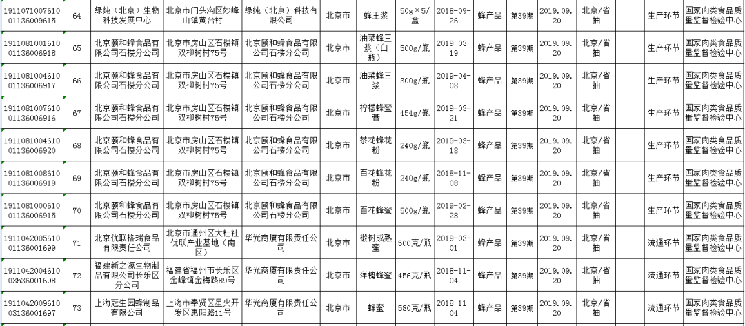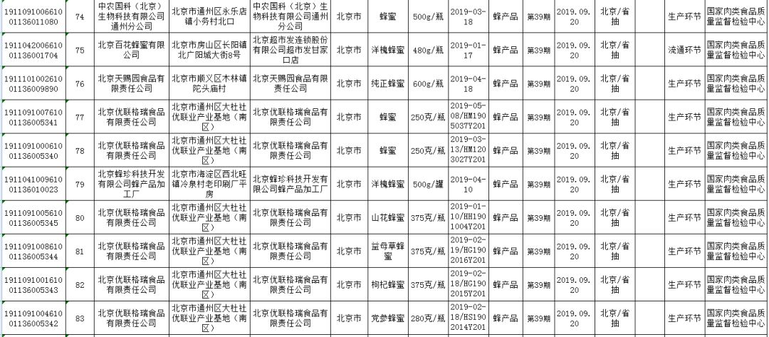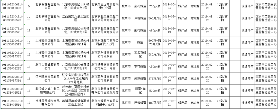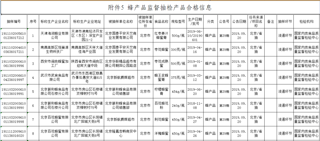 “蜂产品十大品牌—恒亮蜂业” 绿色有机蜂产品提供者 根据《中华人民共和国食品安全法》等法律法规要求,以及北京市食品安全监督抽检计划和相应的抽检细则,北京市市场监督管理局组织抽检了方便食品,罐头食品,糖果、巧克力制品,蜂产品,其他酒类,黄酒,薯类和膨化食品,焙炒咖啡,无糖食品,糕点及面包,饼干,可可及其制品12类食品847批次样品。根据食品安全国家标准检验和判定,其中蜂产品共抽检103批次,全部合格。以下是此次蜂产品抽检信息: 来源:北京市市场监督管理局 【恒亮合作品牌】 ⊙版权声明:文章配图源于网络,经恒亮蜂产品宣传整理编辑,如有侵权联系微信号:gezerg 删除。 ⊙注:本文内容仅为普及蜂产品常识,不能作为药物处方使用。 恒亮-中国蜂产品十大品牌,期待您的加盟!