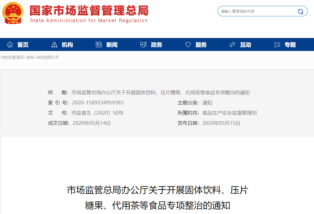 5月15日,市场监管总局办公厅印发关于开展固体饮料、压片糖果、代用茶等食品专项整治的通知,通知指出,重点整治对象包括母婴店、医院及其附近的食品销售单位、线上销售渠道以及面向老年、病弱群体的“保健”类店铺等食品经营者。各地市场监管部门要严格按照《食品安全法》相关规定,对检查和抽检监测中发现的问题及时依法处置,严厉查处违法违规行为,加大处罚力度,落实违法行为“处罚到人”。涉及违反《反不正当竞争法》《广告法》等法律法规的,要实施联合惩戒。涉嫌犯罪的,及时移交公安机关。各省、自治区、直辖市及新疆生产建设兵团市场监管局(厅、委):为加强食品质量安全监管,保障公众身体健康,严厉打击固体饮料、压片糖果、代用茶等特殊形态或包装形式的食品非法添加、虚假宣传、违规销售等违法违规行为,市场监管总局决定开展专项整治工作。现就有关事项通知如下:1.企业名称中含有“生物”“科技”“医药”“营养”等字样的,获证类别为饮料、糖果、果冻、代用茶、茶制品、其他酒、蜜饯、水果制品、水产制品和其他食品的食品生产者及委托生产者。2.母婴店、医院及其附近的食品销售单位、相关食品生产者直销网点、线上销售渠道以及面向老年、病弱群体的“保健”类店铺等食品经营者。1.未取得食品生产经营许可,或超出许可范围从事食品生产经营活动;生产经营未按规定注册、备案的特殊食品。2.生产经营非法添加非食品原料、非食用物质、药品和其他可能危害人体健康物质的食品。3.食品标签、说明书明示或暗示具有疾病预防、治疗及保健功能,利用包括广告、会议、讲座、健康咨询在内的任何方式对食品进行虚假宣传的行为。4.利用网络、会议营销、电话营销、直销等方式违法营销食品,将普通食品与特殊食品进行混放销售、以普通食品冒充特殊食品销售等违规销售行为。食品生产经营者要对生产经营情况和生产经营的食品开展全面自查,重点如下:1.生产许可情况。是否持续保持食品生产许可条件,是否以固体饮料等许可类别超范围生产婴幼儿配方食品、特殊医学用途配方食品、保健食品、特殊膳食食品等。2.过程控制情况。是否采购使用无合格证明、不符合食品安全标准的食品原料、食品添加剂,是否按照食品安全标准要求设立食品安全关键环节的控制措施及操作规程,是否无产品标准受托生产食品,受托生产是否按照规定留存样品并做好记录。3.非法添加情况。食品原料是否来源明确、标识清楚,是否专人管理食品添加剂,生产过程中是否按照产品配方进行投料,原料领用、投料等记录是否齐全,是否违法添加药品、非食用物质、仅限用于保健食品的物品等。4.标签标识情况。产品名称是否反映食品的真实属性,是否使用药品名称命名食品,营养信息是否真实客观,是否执行相应食品安全标准或标注适用婴幼儿等特殊人群,是否标注或暗示有疾病预防、治疗或保健功能及满足进食受限、消化吸收障碍、代谢紊乱或特定疾病人群对营养素或膳食的特殊需要。5.宣传和销售情况。是否如实记录进货查验等信息,是否购进标签、说明书涉及疾病预防、治疗以及保健功能的普通食品并与特殊食品混放销售,是否在销售中利用会议、讲座、健康咨询、专家推介、虚假广告等形式向婴幼儿、儿童、老年等特殊人群进行虚假宣传,是否未经许可或在许可登记的经营场所外,利用网络、会议、电话等营销方式违法销售。(二)加强监督检查和抽检监测,严厉打击违法违规行为1.加强监督检查。各地市场监管部门要结合许可工作,对整治对象进行全面梳理,掌握产品名称、执行标准、原料使用、适用人群、包装或食用形式、委托生产等情况。要结合企业自查情况,重点检查企业是否超许可范围生产经营,原料是否合法合规,采购、投料等记录是否真实,是否非法添加,标签标识是否虚假,是否非法销售和虚假宣传等。对发现涉嫌非法添加、非法声称产品功效的产品,要及时进行核查,严防严控食品安全风险。2.加强抽检监测。各地市场监管部门要对有委托生产、涉嫌疾病预防、治疗及保健功能声称或“纤体”“瘦身”等类似宣传用语、有适宜人群或定量食用的食品,加大抽检监测力度。重点检验与宣传用语相关的物质是否符合规定,是否非法添加咖啡因、双醋酚丁、匹克硫酸钠、麻黄碱、伪麻黄碱、酚酞、西地那非、育亨宾、布洛芬、盐酸二甲双胍、γ-羟基丁酸等药品、非食用物质以及其他可能危害人体健康的物质。3.严厉查处违法违规行为。各地市场监管部门要严格按照《食品安全法》相关规定,对检查和抽检监测中发现的问题及时依法处置,严厉查处违法违规行为,加大处罚力度,落实违法行为“处罚到人”。涉及违反《反不正当竞争法》《广告法》等法律法规的,要实施联合惩戒。涉嫌犯罪的,及时移交公安机关。(一)第一阶段:2020年7月31日前,督促食品生产经营者开展自查,全面排查食品安全风险。(二)第二阶段:2020年8月1日至2020年10月31日,开展集中整治,严厉查处违法违规行为。(三)第三阶段:2020年11月,对专项整治工作进行总结,完善相关工作制度措施。(一)强化组织实施。各地市场监管部门要提高政治站位,坚持以人民为中心,落实属地责任,结合实际情况制定本地专项整治工作细化方案,认真抓好落实,做