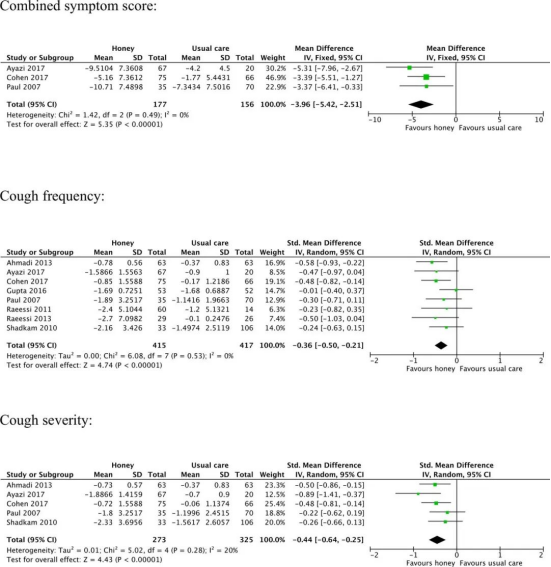 有关于蜂蜜药用价值的书面记述,最早于公元前2000年的苏美尔文字。我国的中医古籍中对使用蜂蜜的叙述更是十分普遍,蜂蜜还是我国《药食同源食品目录及新资源食品名单》收录的药食同源物之一。近年来,在滥用抗生素的背景下,医学界也开始重新认识蜂蜜的价值,尤其是处理伤口及缓解小儿咳嗽等方面。WHO也在一些文献中提到了蜂蜜可以用于缓解儿童的咳嗽。2012年以色列人发表了“蜂蜜对夜间咳嗽和睡眠质量的影响”的文章,首次用「双盲实验」的方式得到了蜂蜜能够改善咳嗽的结果。因此,在众多有关蜂蜜的“偏方”里,目前只有蜂蜜缓解咳嗽证据最硬气。2018年英国国家临床优化研究所(NICE)发布了指南,专门对咳嗽问题提出了权威的解决办法。NICE表示,患者治疗咳嗽的首要方法应该是蜂蜜和非处方药物。执业护士应推荐蜂蜜、草药和止咳药作为急性咳嗽的一线治疗方法。该指南由NICE和英国公共卫生部(PHE)共同制定,涵盖了 成年人、年轻人和儿童的与上呼吸道感染或急性支气管炎相关的急性咳嗽处方。在指南的“自我护理”部分提到,可以将蜂蜜推荐给一岁以上的人 (一岁以下的幼儿不能吃蜂蜜)。尽管指南也提到:自我护理推荐方案是基于“有限证据”,即它们“对缓解咳嗽症状有一定益处”。这里提到的“有限证据”估计是指蜂蜜疗效的双盲实验不够多,所以还需要科学家们继续努力。所以,蜂蜜在缓解咳嗽症状,尤其是小儿咳嗽方面的效果是有科学依据的,而且蜂蜜是天然的、美味的食品,常备手边还可以缓解大量脑力和体力劳动造成的低血糖问题,在你精神困顿的时候来一口准没错。不过很多时候,不给6岁以下幼儿用药止咳,对大人来说也是一种挑战,也许止咳止住的只是家长的焦虑,对孩子未必有好处,了解孩子背后咳嗽的原因,并采取合适的护理或治疗,才是应对咳嗽的正确做法。牛津大学早在2020年曾发表研究结果表明:蜂蜜治疗上呼吸道感染效果好,还能防止病菌耐药性。2022-12-09,中国蜂业杂志刊发由刘国龙、吕素媛、吴秋、耿越团队发表的《蜂产品治疗和预防新型冠状病毒的研究》综述论文,详细介绍了近年来蜂产品在抗新型冠状病毒方面的最新研究进展。该论文结论:蜂产品自古以来就因其药用价值而被广为利用。不同蜂产品在治疗和预防新冠病毒侵害方面的作用和有效性大不相同,相比而言,其中具有较为突出作用的蜂产品是蜂蜜和蜂胶。蜂蜜对新冠病毒感染后的纤维化和免疫调节具有一定的正面影响,同时还可以影响病毒的复制······总体而言,蜂产品在缺少新冠病毒特效药物的当下有可能是治疗新型冠状病毒的潜在有希望的辅助和替代方案。北京佑安医院感染综合科主任医师、小汤山方舱医院医疗专家李侗曾在一场新闻连线直播中表示:感染后可以喝蜂蜜水止咳。为了评估蜂蜜在治疗上呼吸道感染的有效性,研究人员筛选出14份与蜂蜜疗法有关的临床试验报告,涵盖1761名患者。对蜂蜜治疗和改善上呼吸道感染的咳嗽症状、睡眠困难、总体主观症状、鼻炎、肌痛、充血和咳嗽的持续时间等14项特征进行了研究。研究发现,蜂蜜疗法能够有效改善上呼吸道感染综合症状、咳嗽频率以及咳嗽时间。具体而言,蜂蜜疗法让患者的咳嗽频率降低了36%,咳嗽的严重程度降低了44%,同时患者感染的持续时间平均缩短了两天。(蜂蜜疗法的患者在综合症状、咳嗽频率和咳嗽严重程度方面的变化图)